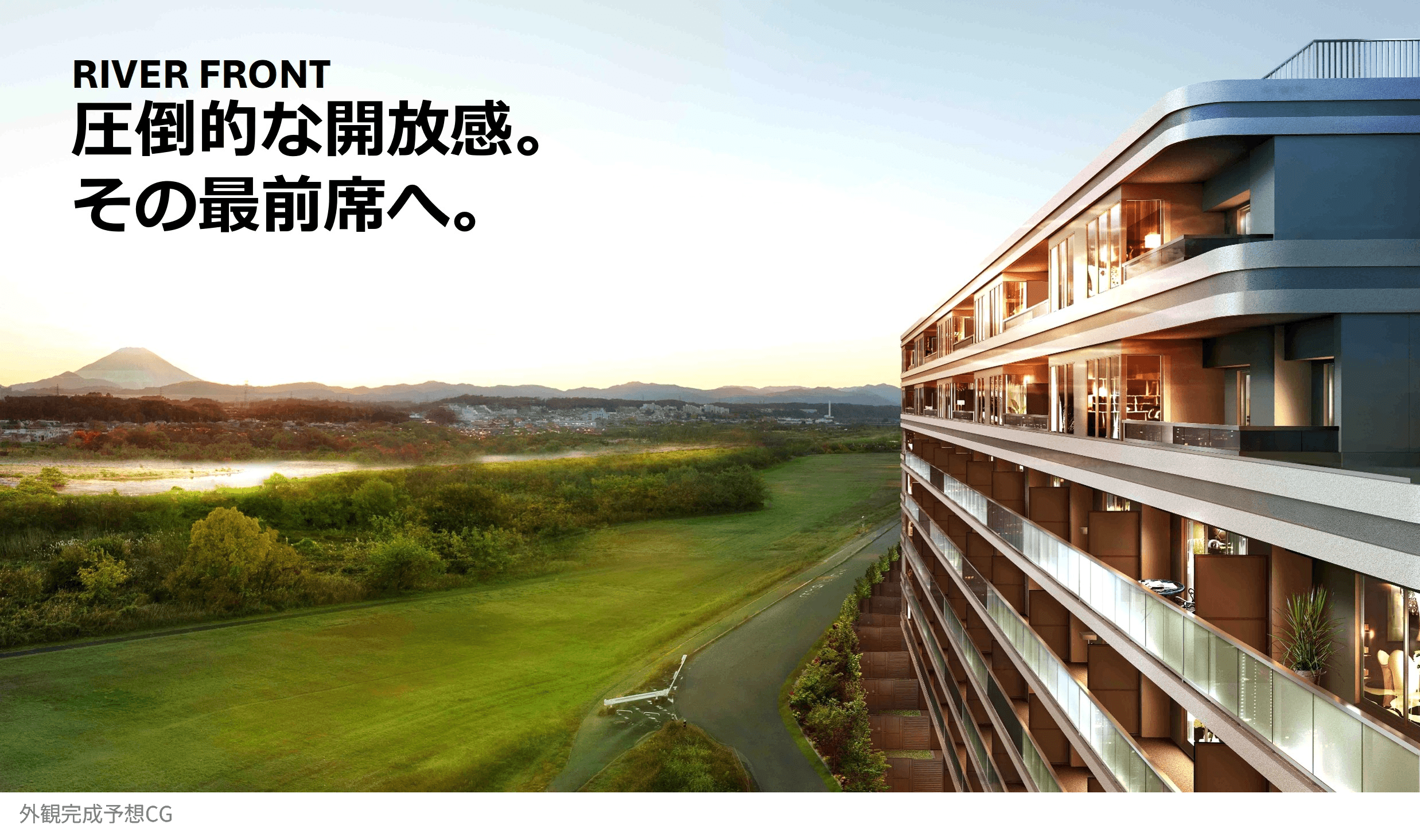 プロジェクトは、多彩な商業店舗が集積する立川エリアでありながらリバーフロントの最前列という、都市利便性と水辺に代表される自然環境を兼ね備えた希少な立地に誕生します。 敷地南側に広がる多摩川の河川敷は対岸まで約500mにわたり視界を遮る建物が無く、開放感あふれる眺望を享受できるロケーションとなります。