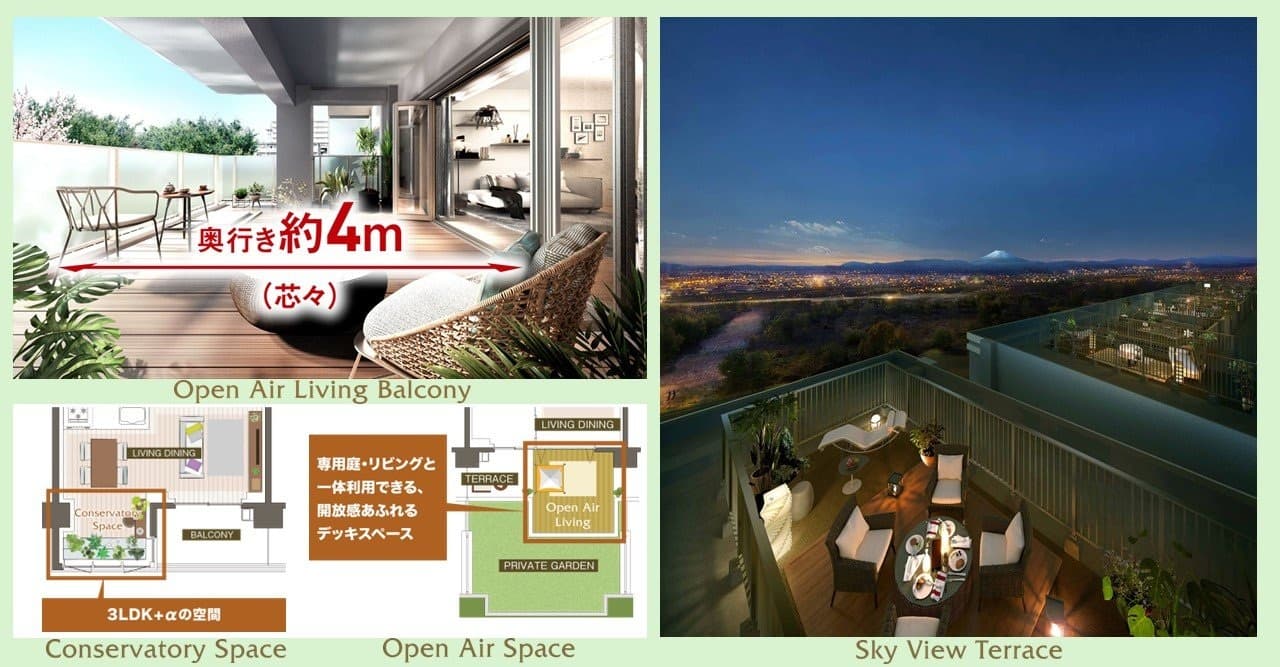 専有部は、1都3県および立川市で供給されている新築分譲マンションの平均面積を超える73㎡超の広さを確保。2面をガラスに囲まれたコンサバトリースペースや奥行き4mのバルコニー、屋上テラスや専用駐車場付きの1階住戸など、個性豊かで多彩なプランを展開します。